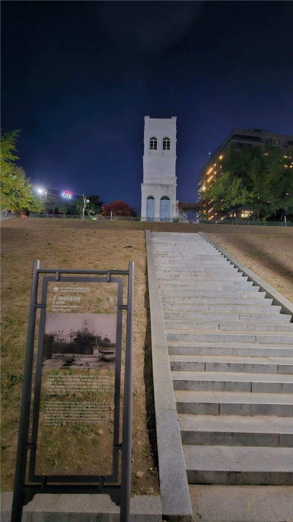 その日の夜、ソウル在住の歴史に詳しい旧友と街を散策していると、宮城県ソウル事務所の前を再び通りました。ここ貞洞は、アメリカ大使館、イギリス大使館など、外交官たちが集うソウル市内の国際地域であり、1896年から1897年にかけて、大通りに隣接する「徳寿宮」にいた国王高宗が、旧ロシア公使館に避難したという「露館播遷」の現場が、宮城県ソウル事務所からわずか300mほどの距離にある高台だったことを教えてもらいました。