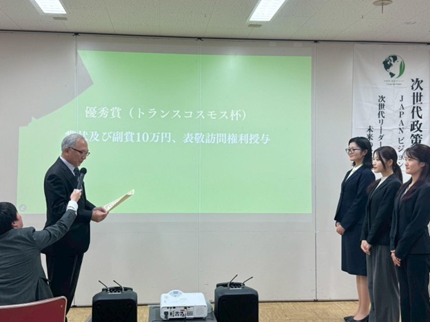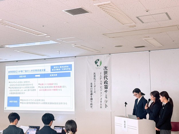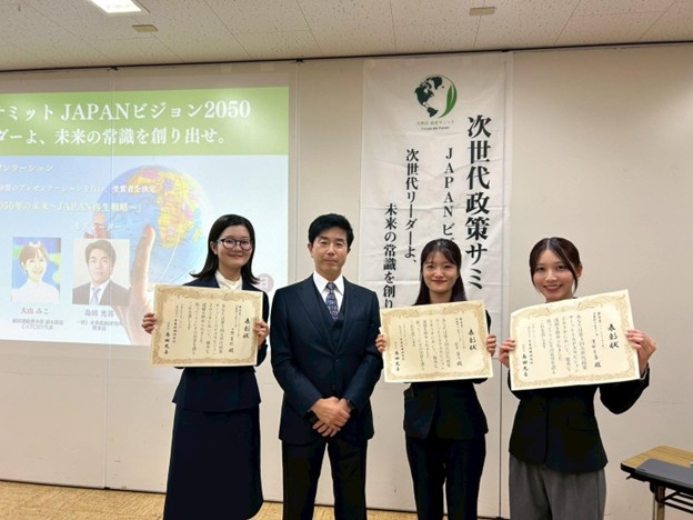 10月26日に開催された「第3回次世代政策サミットJAPANビジョン2050」決勝大会において、公共政策大学院修士2年の鈴木愛乃さん、津田京香さん、丸野泉紀さんの3名が「次世代リスキリングチーム」として出場し、優秀賞を獲得しました。